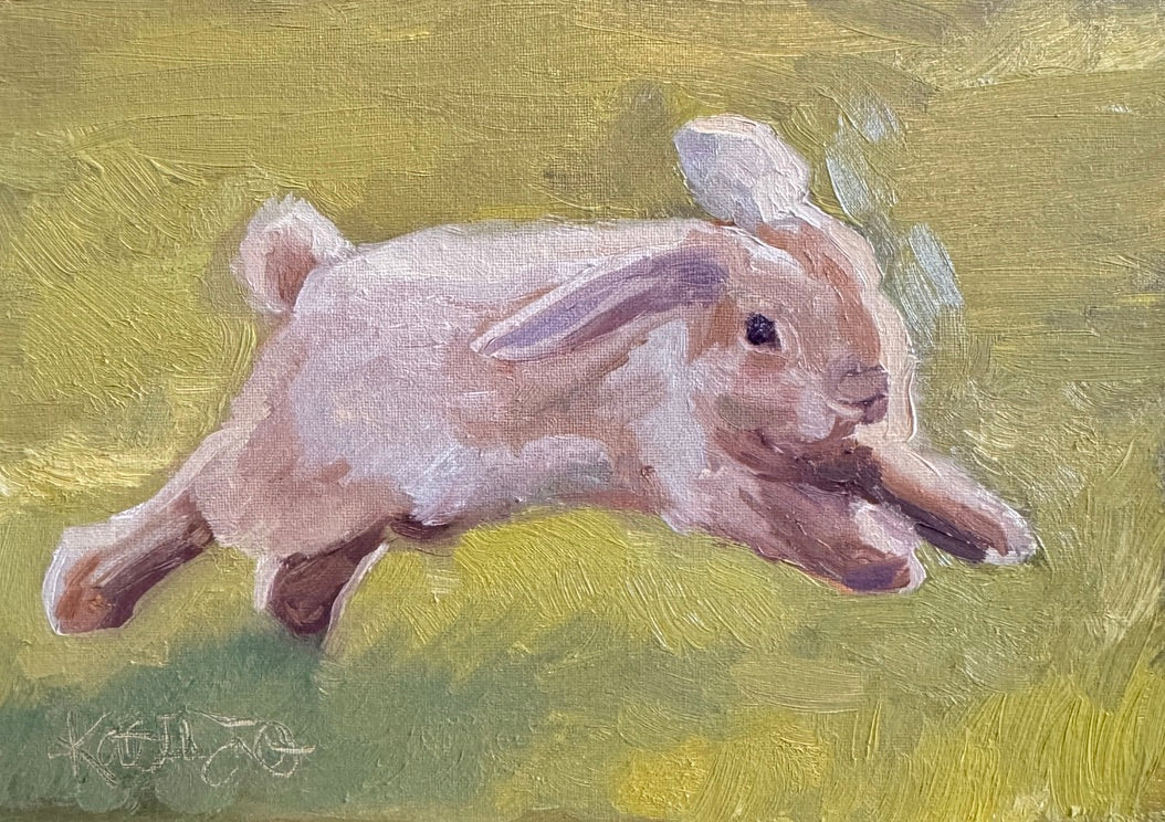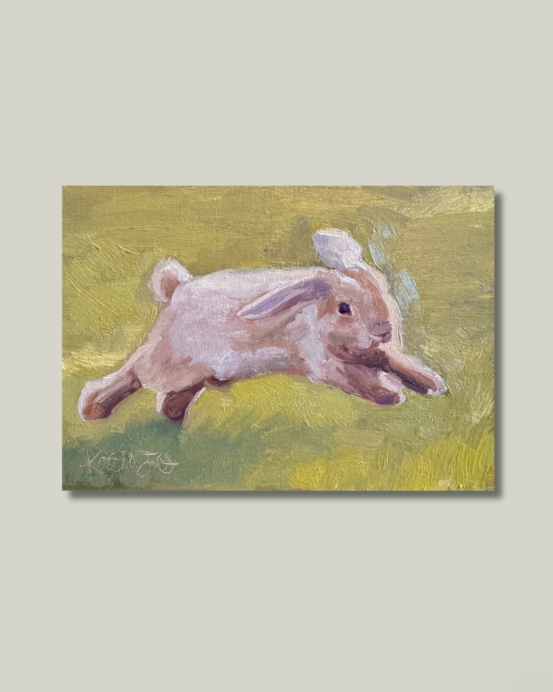 “Leaping into Spring” is a 5x7 original oil painting that captures the sweetest little burst of movement and joy. The soft blush tones of the bunny against the fresh green background feel light and hopeful, like that first warm day after a long winter. I love how playful it is without feeling overly cutesy, and how the gold frame gives it that elevated, heirloom touch. It’s the perfect piece to brighten up a nursery, bookshelf, or spring gallery wall, adding a little life and energy to your space in the most charming way.
