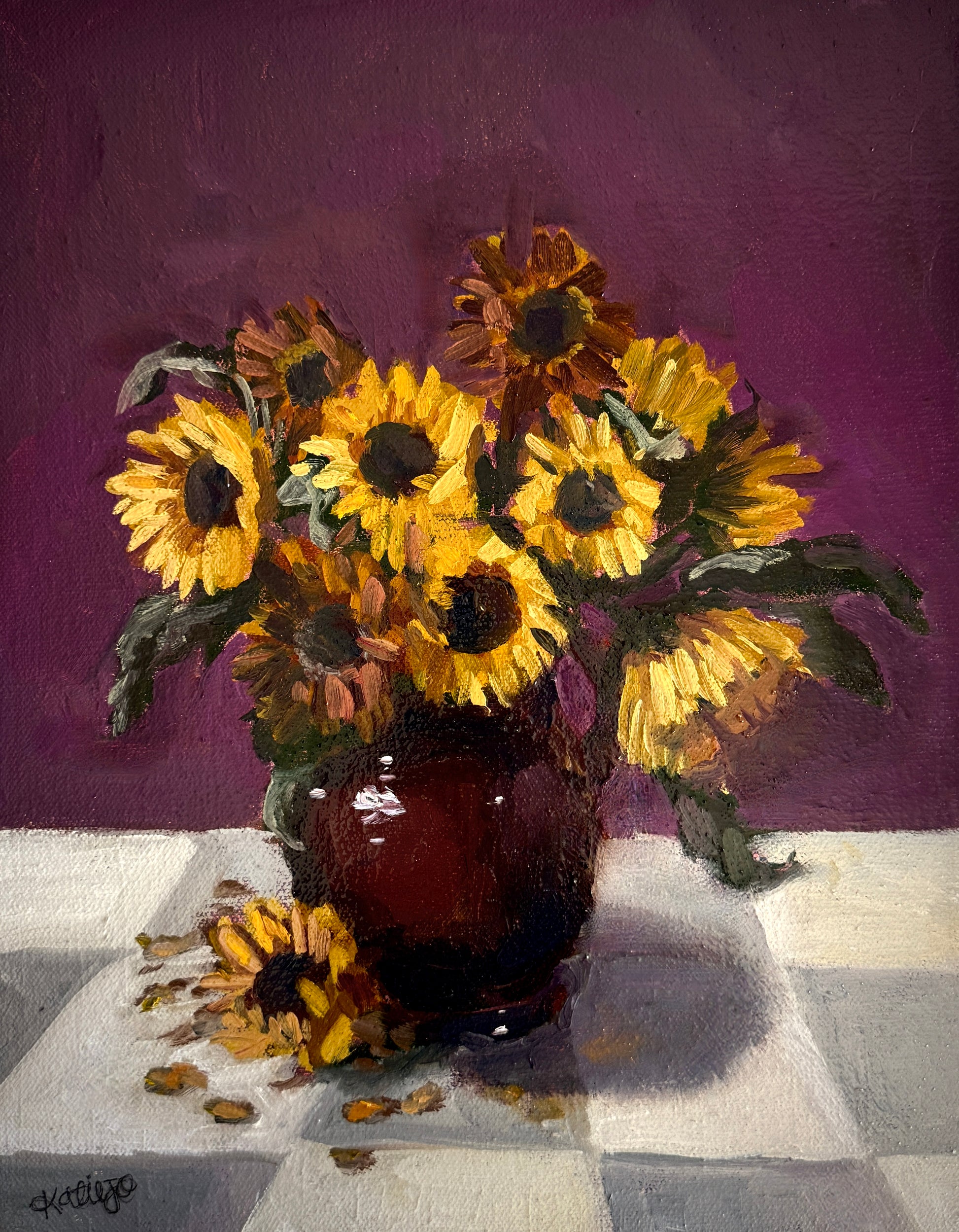Vase of Sunflowers was inspired by playing with complementary colors, checkered floors, and all the moody vibes. The rich plum backdrop and golden blooms make it feel bold yet timeless, perfect for adding warmth and personality to your space.